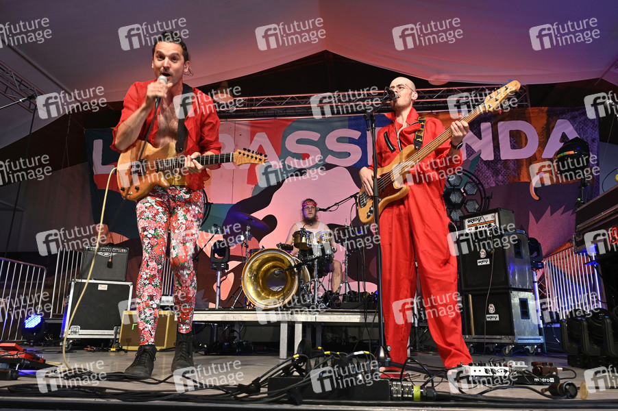 Peter Mayer, Reinhard Hörschläger und Tobias Vedovelli von Beda live beim Festakt zum 100. Geburtstag vom SSV Eggenfelden in der Rottgauhalle. Eggenfelden, 17.06.2022