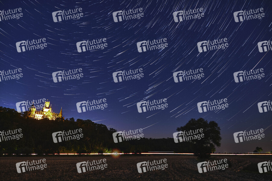 Abendhimmel am Schloss Marienburg auf dem Marienberg (Eine schriftliche Freigabe der Luftbilder durch die Pressesprecherin Annette Langhorst liegt vor). Der Startrail-Effekt entstand durch Langzeit- und Mehrfachbelichtung und zeigt die Sternenspuren duch die Erdrotation. Nordstemmen, 13.08.2022
