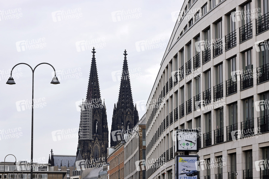Der Dom ragt über Gebäude in der Kölner Innenstadt. Im Erzbistum Köln schwelt ein Konflikt: Während Kritiker von Kardinal Woelki wegen dessen Umgang mit Kindesmissbrauch in der katholischen Kirche auf einen Neuanfang setzen, lehnt der dieser seinen Rücktritt kategorisch ab. Termine für Kirchenaustritte sind auf Monate hin ausgebucht. (Themenbild, Symbolbild) Köln, 26.06.2021