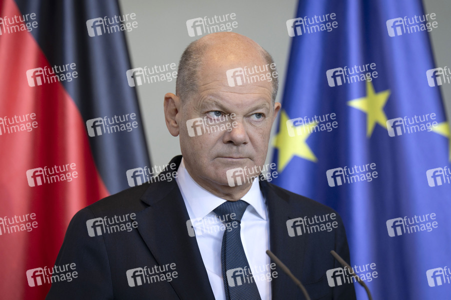 Olaf Scholz beim Empfang des Königs von Jordanien zu einem gemeinsamen Gespräch und anschließendem Pressestatement im Bundeskanzleramt. Berlin, 03.04.2025