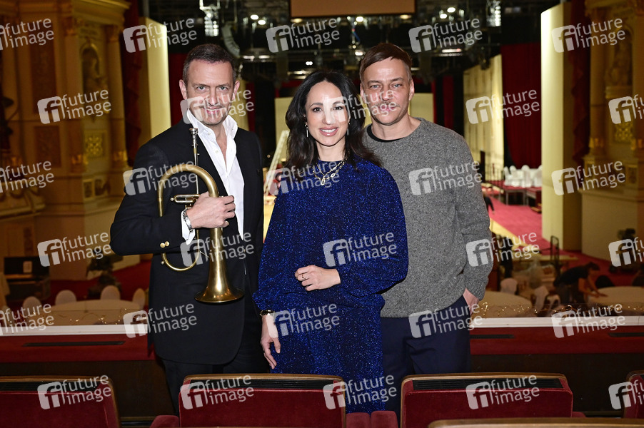 Till Brönner, Stephanie Stumph und Tom Wlaschiha bei der Pressekonferenz zum SemperOpernball 2025 in der Semperoper. Dresden,06.02.2025
