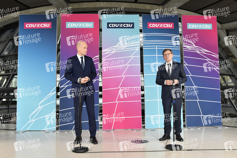 Ralph Brinkhaus und Johann Wadephul bei einem Pressestatement der CDU/CSU-Bundestagsfraktion vor der Fraktionssitzung auf der Fraktionsebene im Reichstagsgebäude. Berlin, 18.05.2021