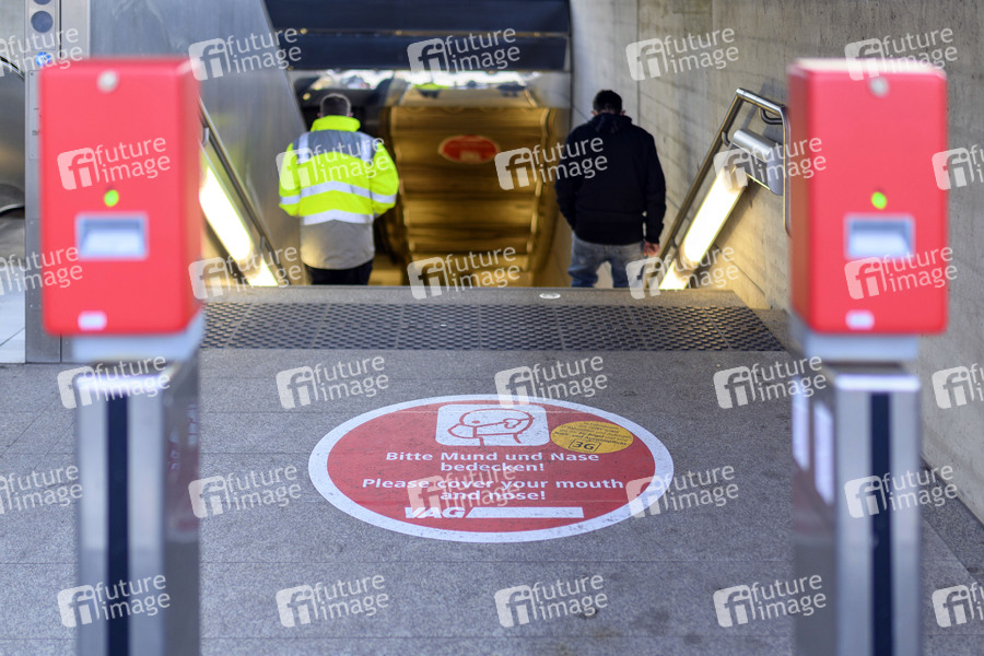 Nahverkehr, U-Bahn, U-Bahn-Haltestelle, Piktogramme, Maske tragen, 3G-Nachweis, 3G-Regel, geimpft, genesen, getestet, Corona, Corona-Regeln, Mindestabstand, Maskenpflicht, Infektionsschutz, Infektionsschutzgesetz, Bayern, öffentlicher Personennahverkehr, Mund-Nasen-Schutz, Mund-Nasen-Bedeckung, Bus, Bahn, Bahnen, ÖPNV, Symbolbild, Symbolfoto