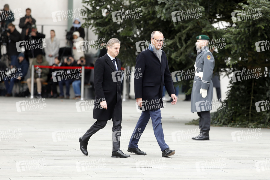 Robert Golob und Friedrich Merz beim Empfang des Ministerpräsidenten von Slowenien mit militärischen Ehren zu einem gemeinsamen Gespräch mit anschließendem Pressestatement im Bundeskanzleramt. Berlin, 28.11.2025