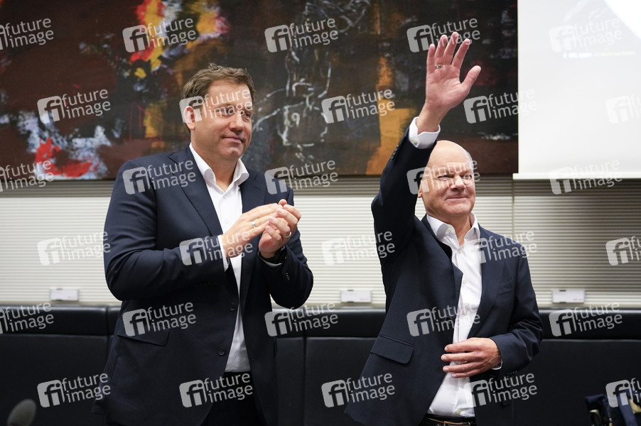 Lars Klingbeil und Olaf Scholz bei der Fraktionssitzung der SPD-Bundestagsfraktion nach dem Ampel-Aus im Reichstagsgebäude. Berlin, 06.11.2024