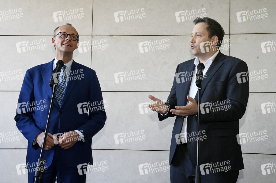 Friedrich Merz und Lars Klingbeil beim gemeinsamen Auftaktstatement der Parteivorsitzenden von CDU, CSU und SPD zur Bildung einer neuen Regierungskoalition im Willy-Brandt-Haus. Berlin, 28.03.2025