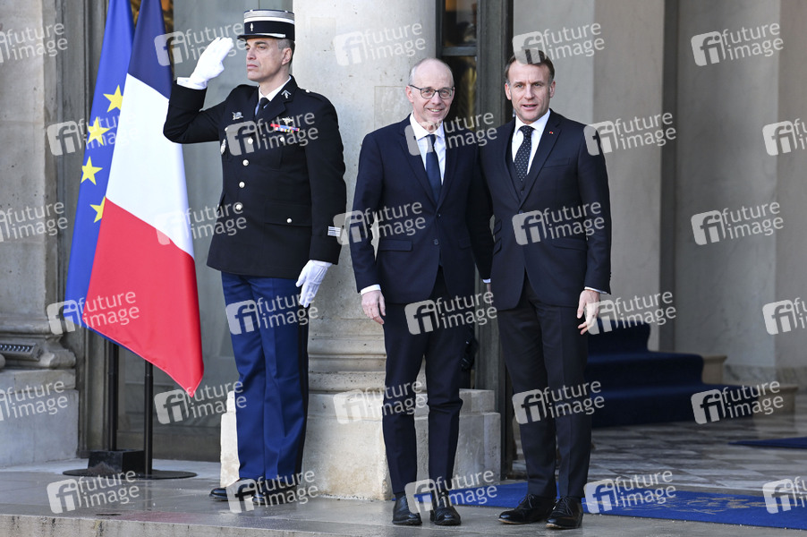 Luc Frieden und Emmanuel Macron beim Treffen der Koaltion der Willigen zu Beratung über die militärische Unterstützung für die Ukraine im Élysée-Palast. Paris, 06.01.2026