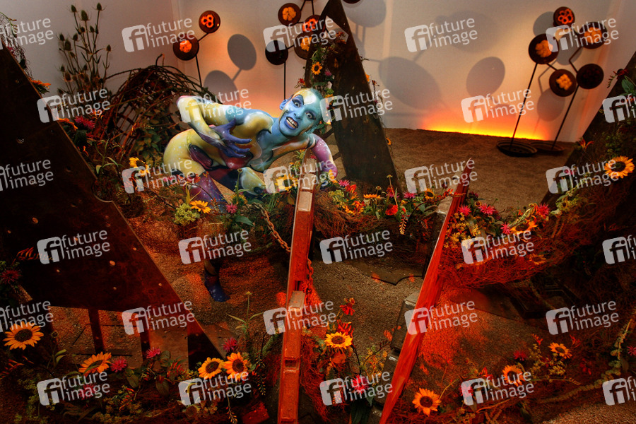Bodypainting und Fotoshooting mit Model Sarah am Tag der offenen Tür der Meisterschule Justus-von-Liebig-Schule, Abteilung Floristik in Hannover-Ahlem. Künstler: Jörg Düsterwald
