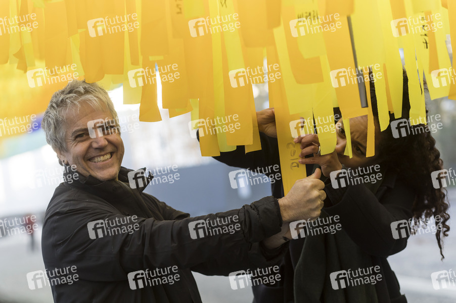 Patrick Shearn mit Joy Denalane in seiner Kunstinstallation 'Visions in Motions' auf der Straße des 17. Juni vor dem Brandenburger Tor, anlässlich der Feierlichkeiten zum 30. Jahrestags des Mauerfalls. Die 150 Meter lange Installation besteht aus 100.000 Stoffstreifen, von denen 30.000 mit kleinen Botschaften mit Wünsche und Erinnerungen zum Mauerfall beschriftet sind. Berlin, 10.11.2019