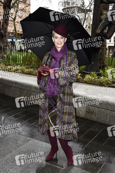 Patricia Ward Kelly vor der Gene Kelly Statue beim Launch des 'Scenes in the Square' Statuen-Weges mit acht ikonischen Filmszenen von 1920-2020 am Leicester Square. London, 27.02.2020
