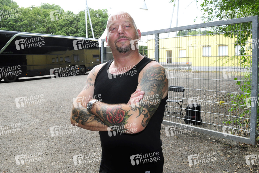 Carl Fornia von Mono Inc. bei der Ankunft zum Peißnitz Kultursommer Open Air 2020 auf der Freilichtbühne Peißnitzinsel. Halle/Saale 14.08.2020