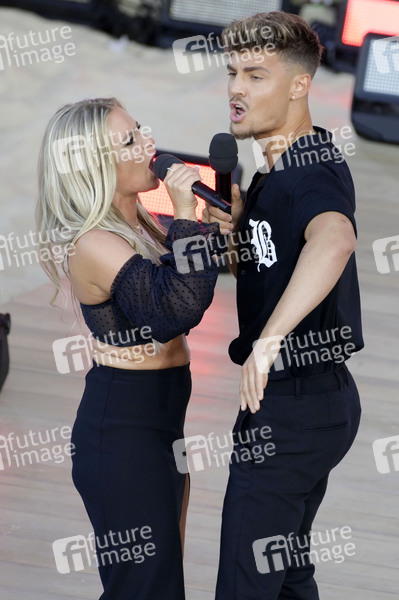 Marina Marx und Karsten Walter in der TV Show 'Die große Schlagerstrandparty 2022 - Es geht wieder los!' im Amphitheater Gelsenkirchen. Gelsenkirchen, 09.07.2022