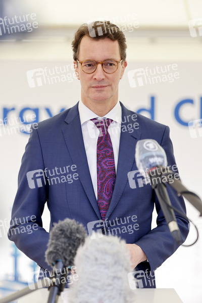 Politiker, CDU, Union, Ministerpräsident des Landes Nordrhein-Westfalen, NRW-Ministerpräsident, Auftritt, Shell, Industrie, Raffinerie, Royal Dutch Shell, Produktionsanlage, Gaskonzern, Gasindustrie, Ölindustrie, Ölkonzern, Treibstoff, Klimaziele, Förderung, Energiewende, Chemieindustrie, Kohlendioxid-Ausstoß, Gas, Erneuerbare Energien, Umweltschutz, Energietechnik, Umweltpolitik, Gaspreis, Gaspreise, Industriepolitik, Energiepolitik, Shell Energy, Chemicals Park Rheinland, CO2-neutral, Nachhaltigkeit, CO2-Neutralität, Biogas, Bio-Gas, Bio-LNG, flüssiges Gas, Biomethan, Methangas, Methan-Gas, Baustelle