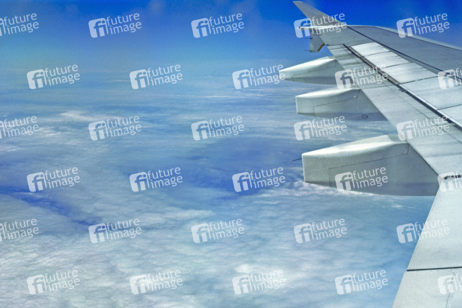 Reisen, Flugzeug, Fluegel, Wolken, Hoehe, Ferne, Bewegung, Verkehr, Aufbruch, Heimkehr, Blau, Weiss, Himmel, Tourismus, Vorwaerts, Mobilitaet, Jetlag, Hoehenangst, Hoehenkrankheit, Flugangst, Ozon, Flugbenzin, saubere Luft