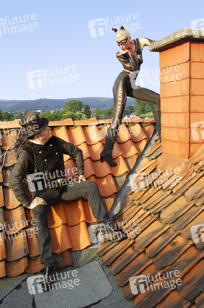 GEEK ART - Bodypainting meets SciFi, Fantasy and more: Catwoman Photoshooting mit Model Randy als Catwoman und Schornsteinfeger Martin auf dem Dach eines Wohnhauses in Hameln - Ein Projekt des Fotografen Tschiponnique Skupin, Bodypainting: Jörg Düsterwald