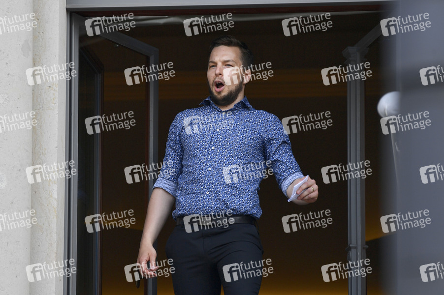 Erik Rosenius bei der Hotel de Rome Wiedereröffnung mit Mitgliedern des Internationalen Opernstudios der Staatsoper Unter den Linden, welche aus den Fenstern des Hotels mit Renato Rascels 'Arrivederci, Roma' und Paul Linckes 'Berliner Luft' den Bebelplatz zum Klingen bringen. Berlin, 17.06.2020