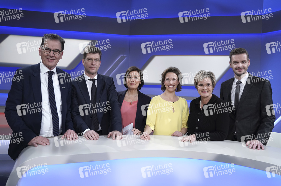 Gerd Müller, Christoph Schwennicke, Sandra Maischberger, Anna Planken, Gloria von Thurn und Taxis und Florian Schroeder in der ARD-Talkshow 'maischberger. die woche' im WDR Studio BS 3. Köln, 21.01.2020