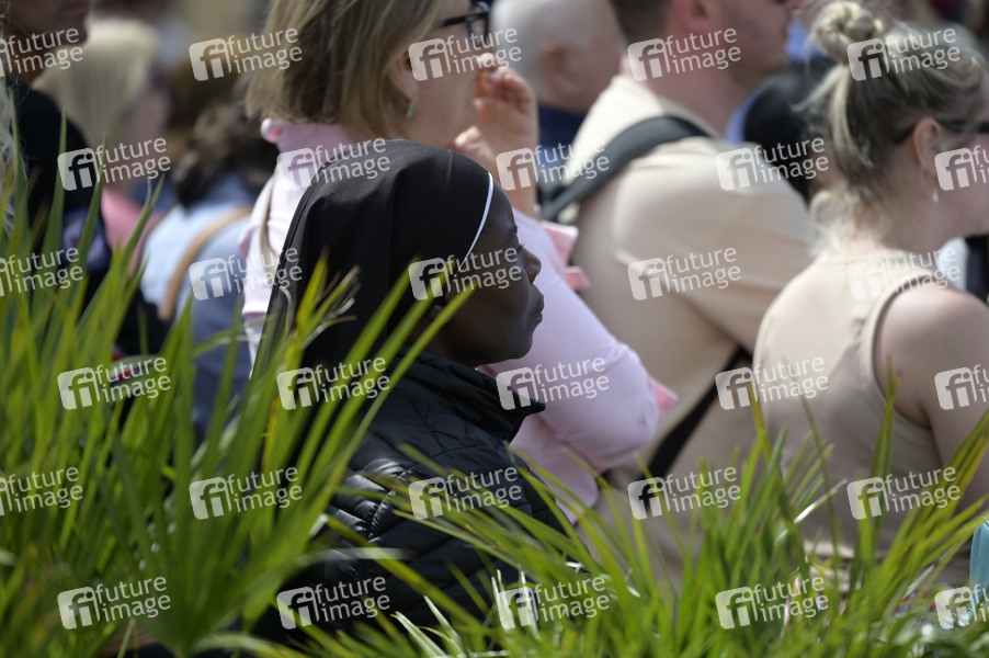 Trauernde Menschen nach dem Tod von Papst Franziskus auf dem Petersplatz. Rom, 21.04.2025