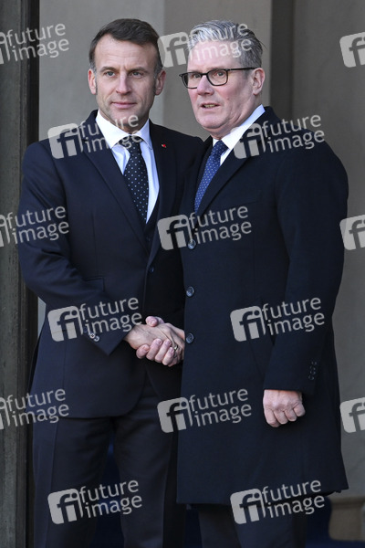 Emmanuel Macron und Keir Starmer beim Treffen der Koaltion der Willigen zu Beratung über die militärische Unterstützung für die Ukraine im Élysée-Palast. Paris, 06.01.2026