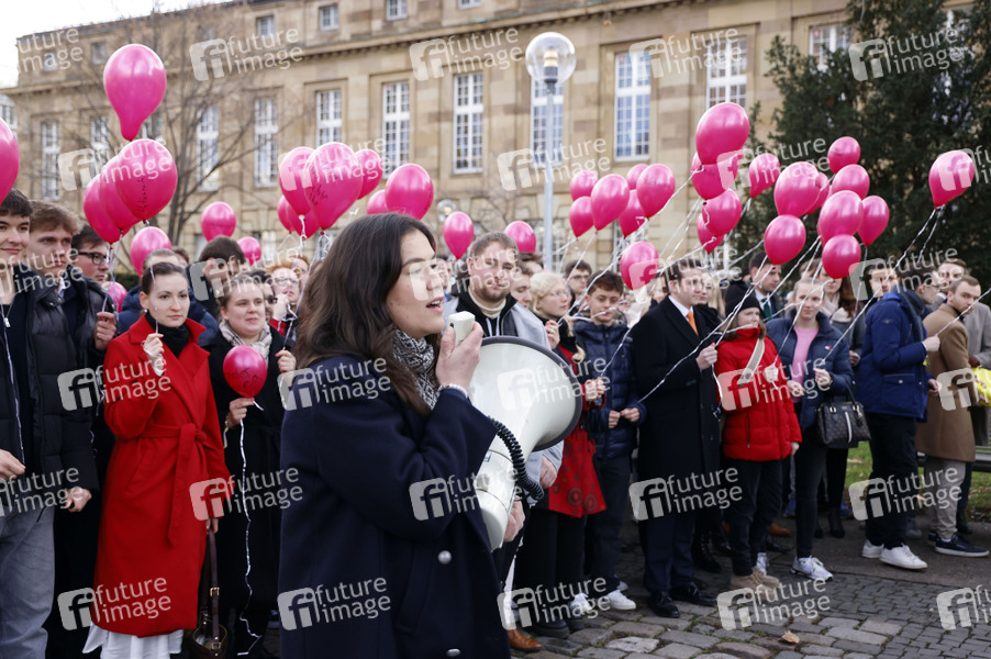 Franziska Brandmann und Mitglieder der Jungen Liberalen lassen traditionell Luftballons mit Forderungen steigen beim FDP Dreikönigstreffen 2025 im Stuttgarter Opernhaus. Stuttgart, 06.01.2025