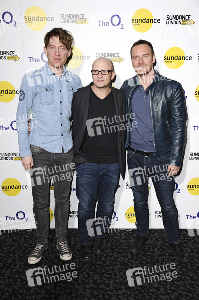 Domhnall Gleeson, Lenny Abrahamson und Michael Fassbender bei der Premiere von 'Frank' auf dem Sundance London Festival 2014 in der O2 Arena. London, 25.04.2014