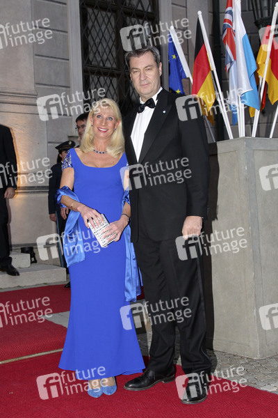 Markus Söder mit Ehefrau Karin Söder beim Empfang der britischen Royals zum Staatsbankett vor der Residenz München. München, 09.05.2019