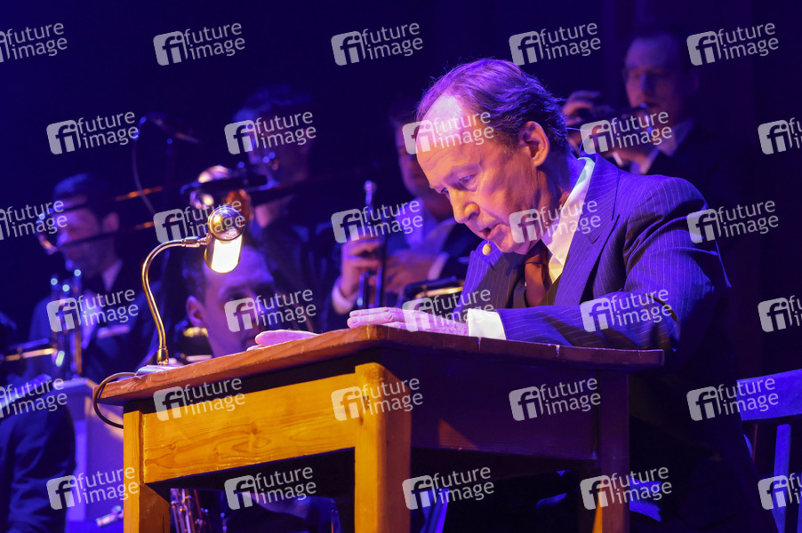 Ulrich Noethen und das Moka Efti Orchestra bei der musikalischen Lesung 'Der nasse Fisch' im Theater am Tanzbrunnen. Köln, 12.03.2025