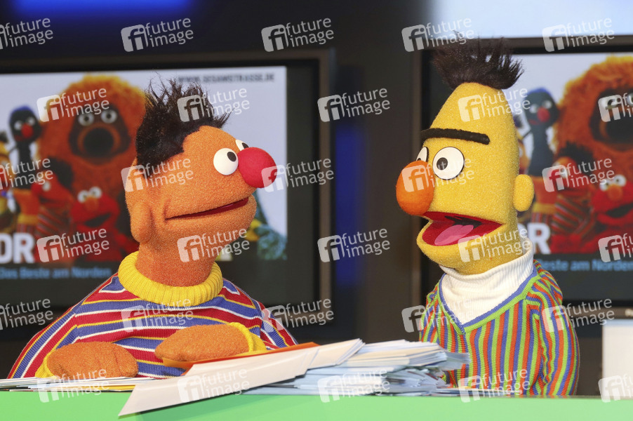 Ernie und Bert bei der Präsentation der Deutsche Post Sonderbriefmarke 'Sesamstrasse' im Sonderpostamt beim NDR Rundfunk. Hamburg, 02.03.2020