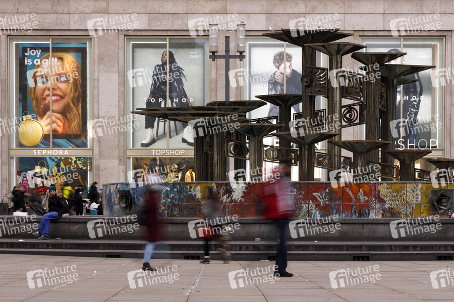 Kunden nutzen die letzte Gelegenheit vor dem Lockdown, um Weihnachtsgeschenke rund um den Alexanderplatz zu kaufen. Im Bild der Brunnen der Völkerfreundschaft und Werbeplakate eines Kaufhauses. Aufgrund der Pandemie gelten in Einkaufszonen Regeln wie Mindestabstand und Makskenpflicht. (Themenbild, Symbolbild) Berlin, 15.12.2020