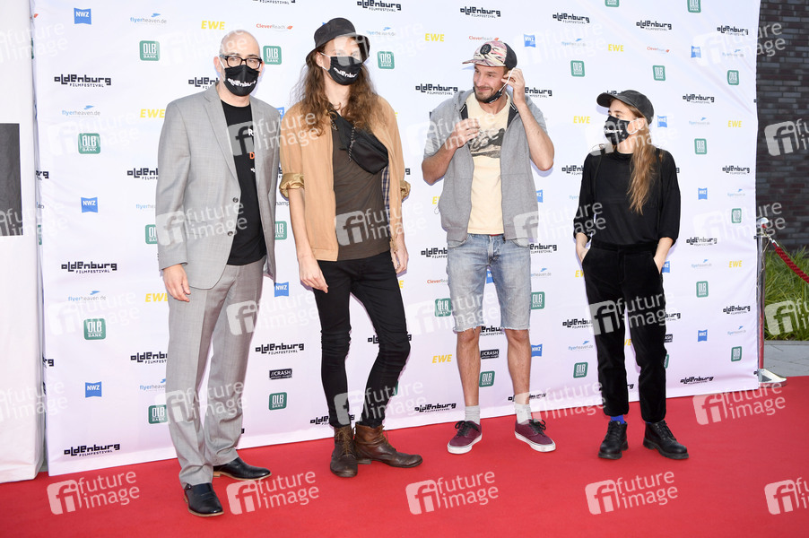 Torsten Neumann, Dennis Stormer, Daniel Fuchs und Moa Nillson bei der Eröffnung vom 27. Internationalen Filmfest Oldenburg mit der Weltpremiere des Kinofims 'Puppy Love' im Crash Building. Rastede, 16.09.2020