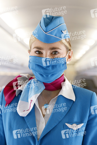 Stewardess von Eurowings bei der Vorstellung des Sicherheitskonzepts am Flughafen Köln Bonn während der Coronakrise 'Sicher in Corona Zeiten'. Köln, 27.05.2020
