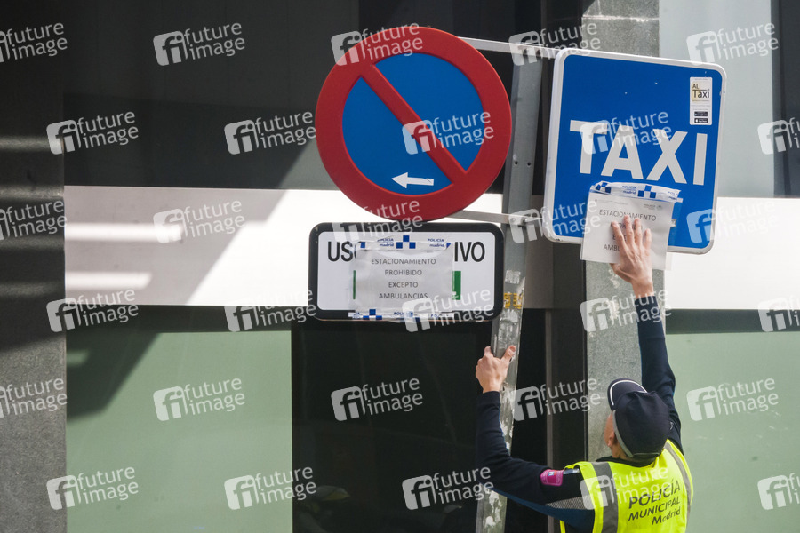 Die spanische Regierung hat den Ausnahmezustand wegen des Coronavirus COVID-19 erklärt. Die Bevölkerung steht 15 Tage zu Hause unter Quarantäne. Die spanische Polizei und Armee überprüfen Menschen, die durch die Straßen gehen. Erlaubt sind Gänge in Krankenhaus, in Supermärkte, Kioske und Apotheken, sowie das Ausführen von Haustieren und der Weg zur Arbeit. Madrid, 19.03.2020