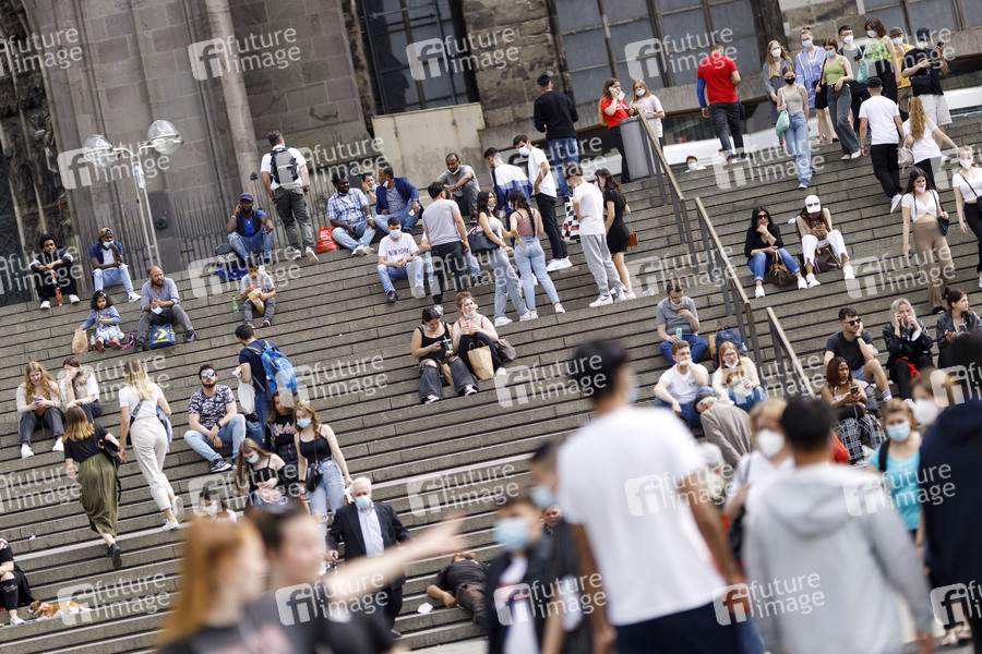 Bei fallenden Inzidenzzahlen und steigenden Temperaturen drängen sich viele Menschen in der Kölner Innenstadt auf der Domtreppe. In Nordrhein-Westfalen gelten weitere Öffnungsschritte, sie ergänzen die Lockerungen, die in der Coronaschutzverordnung vom vorgesehen sind. Es gilt ein Stufenplan mit Öffnungsschritten für die Landkreise und kreisfreien Städten ohne Notbremse, also mit einer stabilen Sieben-Tage-Inzidenz von unter 100. (Themenbild, Symbolbild) Köln, 04.06.2021