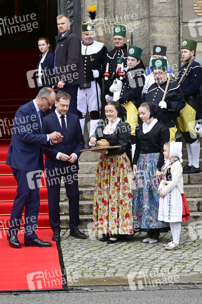 Friedrich Merz und Michael Kretschmer beim Antrittsbesuch des Bundeskanzlers im Freistaat Sachsen in der Sächsischen Staatskanzlei. Dresden, 28.10.2025