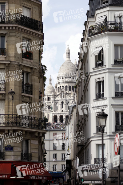 Tourismus, Touristen, Sightseeing, Stadt der Liebe, neobyzantinischer Bau, Architektur, Sommer in Paris, Reiseziel, Frankreich, Kultur, Sacre Coeur, Basilika, Straßenschlucht, Impression, Stadtleben, Stadtbild