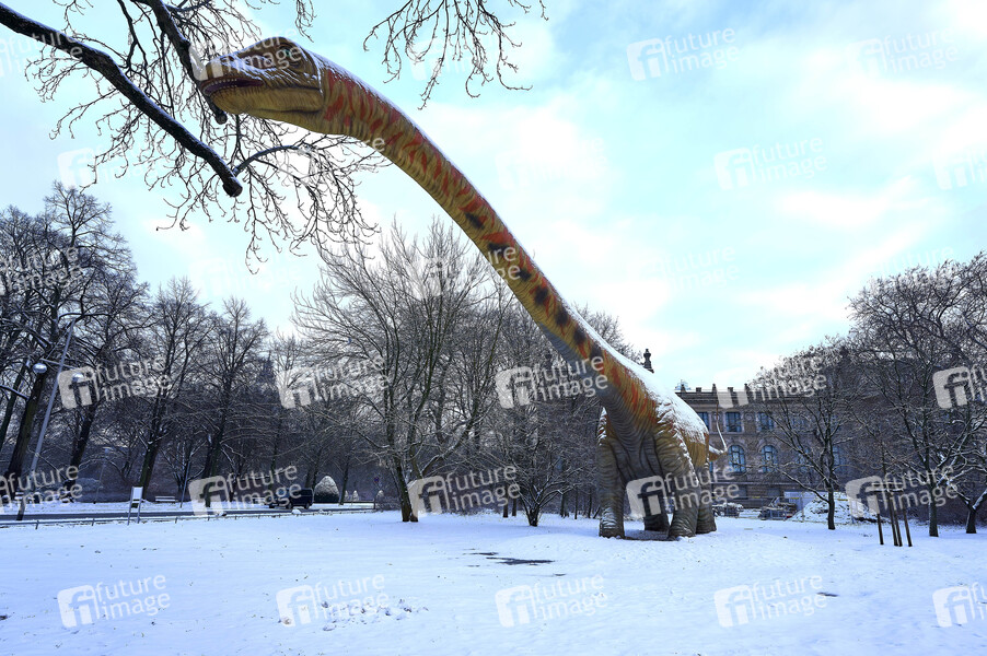 Verschneiter Dinosaurier am Landesmuseum zur Sonderausstellung 'Kinoaaurier. Zwischen Fantasie und Forschung'. Hannover, 30.01.2021