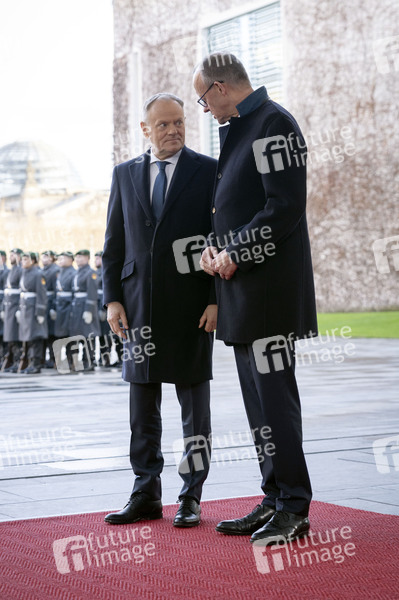 Friedrich Merz beim Empfang des polnischen Ministerpräsidenten Donald Tusk mit militärischen Ehren zu den 17. Deutsch-Polnischen Regierungskonsultationen im Bundeskanzleramt. Berlin, 01.12.2025