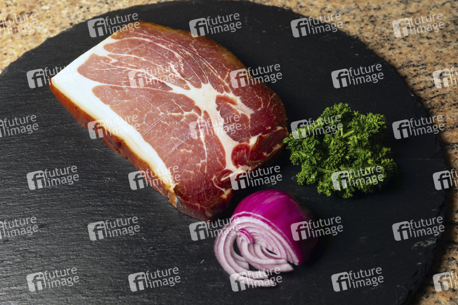 Schinken, Essen, Nahrung, Speise, Ernährung, Zwiebel, Petersilie, Aufschnitt, Brotbelag, Beilage, Pökeln, Räuchern, Trockenpökelung, Symbolbild, Themenbild