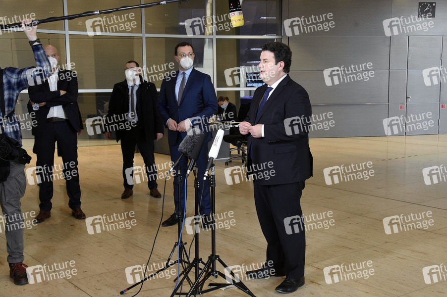 Gesundheitsminister Jens Spahn und Arbeitsminister Hubertus Heil beim Pressestatement zur Verteilung von FFP2-Masken an Hartz-IV-Empfänger am Rande der 206. Sitzung des Deutschen Bundestages in der 'Westlobby', dem Aufenthaltsbereich vor dem Plenarsaal auf der Westseite im Reichstagsgebäude. Berlin, 28.01.2021