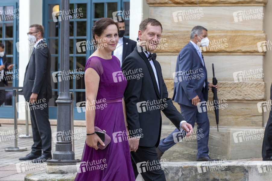 Michael Kretschmer mit Ehefrau Annett Hofmann bei der Eröffnung der Richard-Wagner-Festspiele 2021 mit der Premiere von Richard Wagners 'Der fliegende Holländer' im Bayreuther Festspielhaus. Bayreuth, 25.07.2021