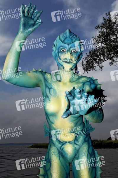 Bodypainting, Body-Painting, Erotik, Frau, Mädchen, nackt, Akt, weiblich, Körperkunst, Körperfarben, Farbe, Bemalung, Kunst, Malerei, Meer, See, Gewässer, Wasser, Monster, Ungeheuer, Fischwesen, Monster aus der Lagune, Science Fiction, Sci-Fi, SciFi, Fantastic, Creature from the Black Lagoon, body painting, erotic, woman, girl, nude, female, body art, colors, sea, Lake, water, monster, fish being