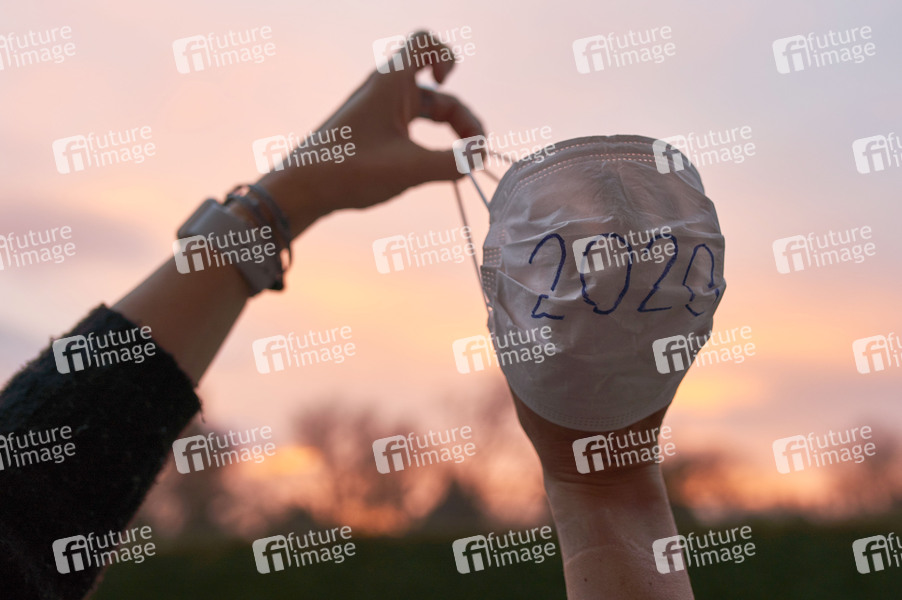 Symbolische Verabschiedung des Jahres 2020 - Mund-Nasen-Bedeckung mit Jahreszahl vor einem Sonnenaufgang zum Abschuß zwischen den Händen gespannt. (Symbolbild, Themenbild) Hannover, 31.12.2020