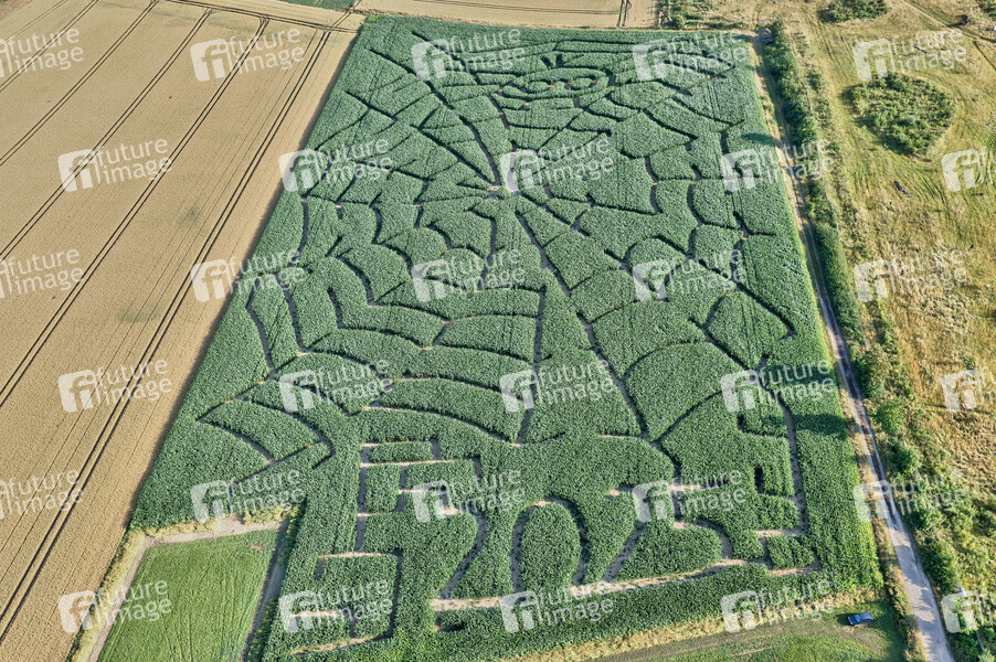 Maisfeld, Feld, Landwirtschaft, Labyrint, Freizeit, Familiespaß, Ausflugziel, temporärer Irrgarten, Freizeiteinrichtung, Sommervergnügen, Luftaufnahme, Luftbild, Drohne, Drohnenaufnahme