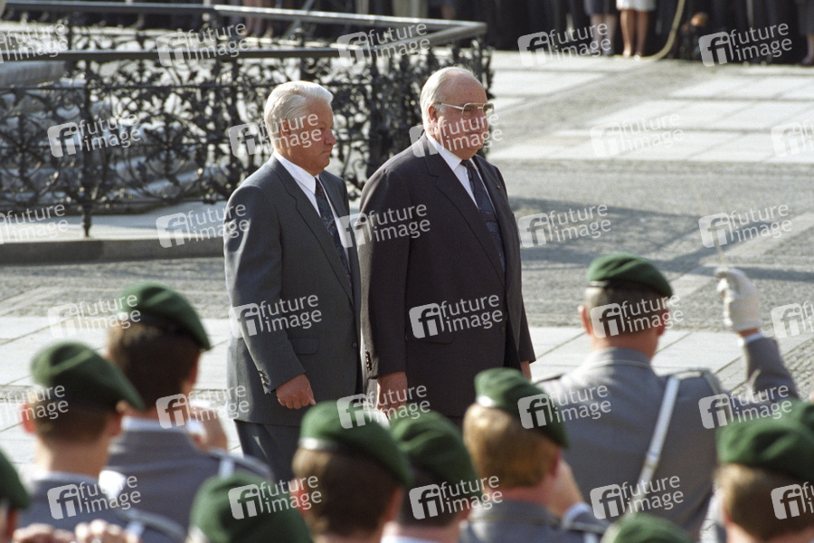 Poilitker, 1991-1999 der erste Präsident Russlands, 1982-1998 der sechste Bundeskanzler der Bundesrepublik Deutschland, Politik, Außenpolitk, Staatsbesuch, Verabschiedung, Besatzungszeit, Besatzungsmacht, Siegermacht, Armee, Soldaten, Uniform, Parade, Militär, Berlin-Brigade, Streitkräfte, Alliierte, Kbsw, Militärparade, Abrüstung, Zeitgeschichte, Zeitgeschehen