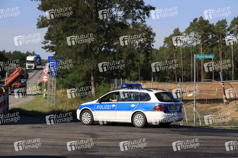 Polizei an der Tesla Straße beim ersten Richtfest auf der Baustelle der Tesla Gigafactory Berlin-Brandenburg. Grünheide, 03.09.2020