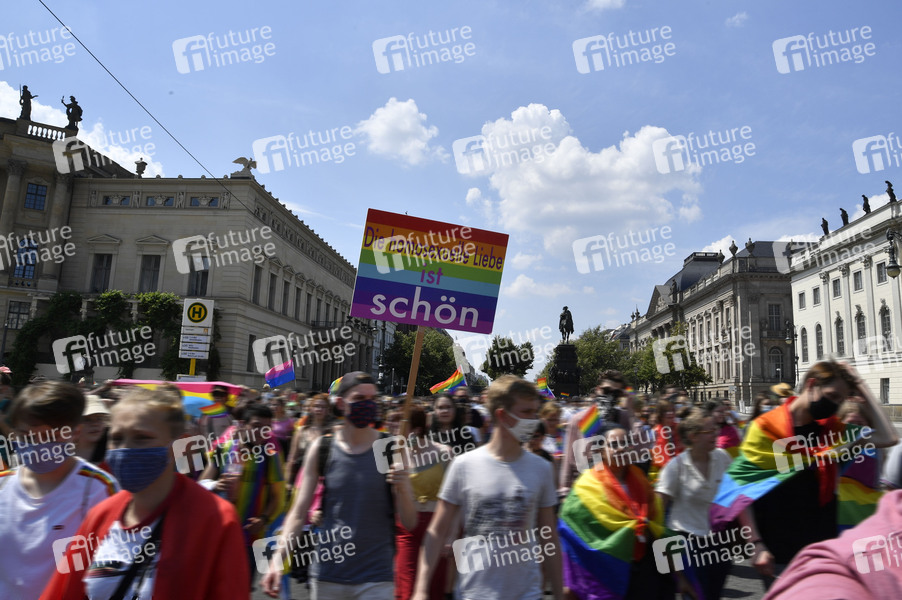 Demonstrationszug mit dem Motto 'Berlin Pride 2020' vom Nollendorfplatz über Potsdamer Straße, Wilhelmstraße und Unter den Linden zum Alexanderplatz. Berlin, 27.06.2020