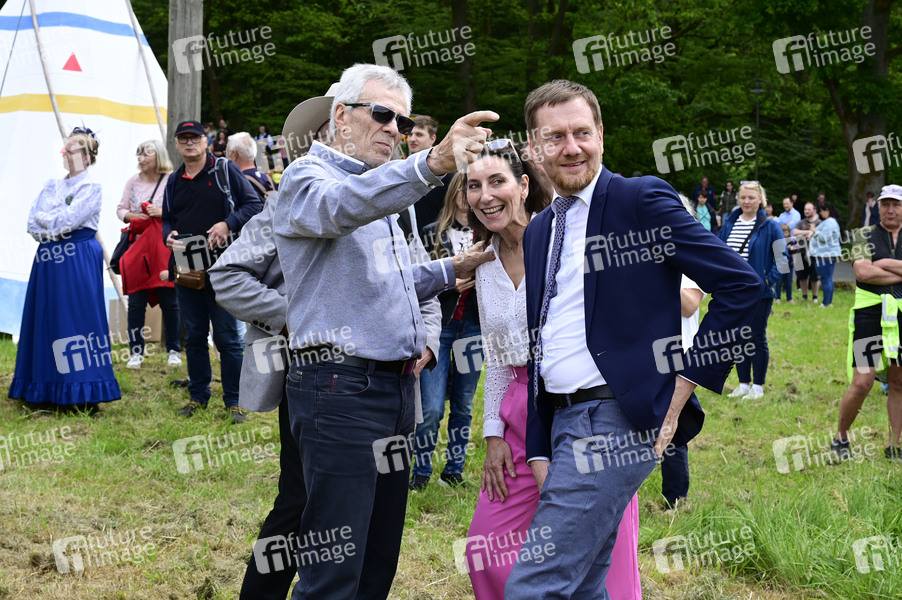 Gojko Mitic mit Freundin Julia und Ministerpräsident Michael Kretschmer bei der offiziellen Einweihung einer Sandstein-Stele in der Nähe des Originaldrehortes des Filmes 'Die Söhne der großen Bärin' im Kurort Rathen. Rathen, 19.05.2024