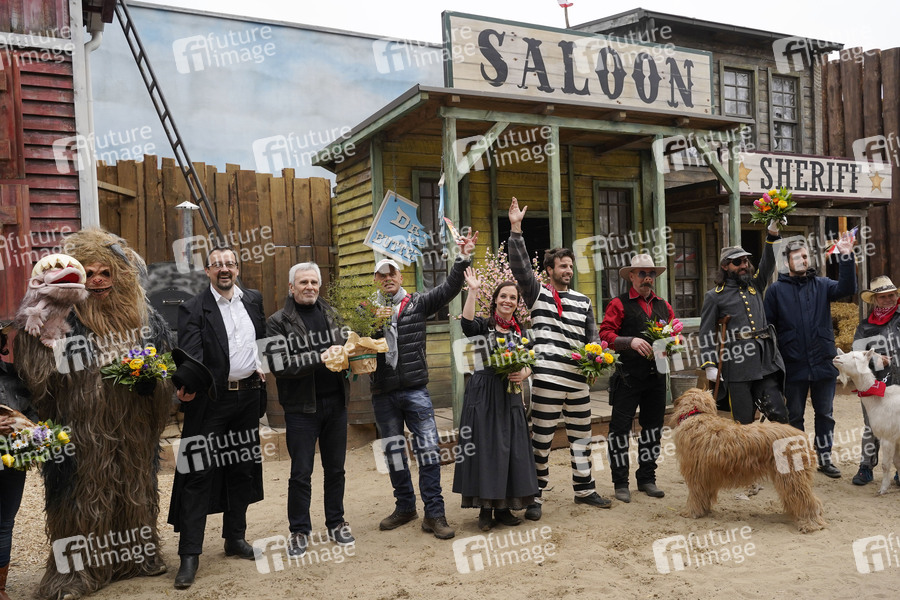 Malte Schatz und Gojko Mitic mit Stuntcrew bei der Premiere der Westernshow 'Tierisch verdreht' beim Saisonstart im Filmpark Babelsberg. Potsdam, 13.04.2019