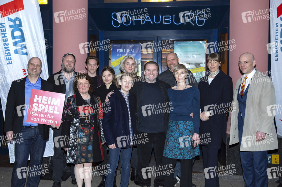 lngmar Cario, Stefan Lampadius, Dagmar Sachse, Alvar Julian Goetze, Hannah Schiller, Moritz Klaus, Antonia Lingemann, Felix Vörtler, Markus Hoffmenn, Anna Stieblich, Anna Böger und Robert Dölle bei der Präsentation des neuen Primetime-Sendeplatzes 'Heimspiel - Serien für den Westen' mit den Previews der TV-Serien 'Ohne Schnitzel geht es nicht', 'Phoenixsee' und 'Meuchelbeck' im Lichtspiel- und Kunsttheater Schauburg. Dortmund, 26.03.2019