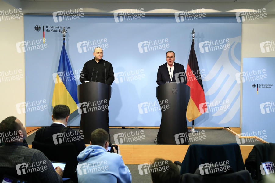 Rustem Umerov / Rustem Umjerow und Boris Pistorius beim gemeinsamen Pressestatement zu den Beratungen zur Entwicklung der Lage in der Ukraine, die deutsch-ukrainische Zusammenarbeit im Bereich der Sicherheit und Verteidigung sowie die Stärkung der ukrainischen Verteidigung gegen die russische Invasion im Bundesministerium der Verteidigung. Berlin, 06.03.2025